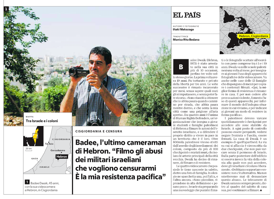 Badee Dwaik (Hebrón, 1973) ha sido detenido en más de 10 ocasiones en su propia ciudad, incluso tres veces un mismo día. La primera con 19 años fue torturado y privado de libertad durante tres años. Las siguientes han sido retenciones de meses bajo prisión administrativa sin conocer ni él los cargos, ni poder presentar recursos. “Han conseguido que camine con miedo, que duerma con miedo y que sienta mi ciudad como una prisión al aire libre”. Desde hace cuatro años, impulsa Human Rights Defenders, una organización que forma a jóvenes escolares y familias palestinas de Hebrón para filmar las actuaciones del ejército en defensa de su derecho a vivir en paz y en su tierra. Más de 800.000 palestinos viven sitiados por diferentes asentamientos de colonos con más de 100 checkpoints, así como diferentes muros que aíslan las arterías principales a la ciudad vieja. Dawik ha decidido quedarse, filmar y resistir.