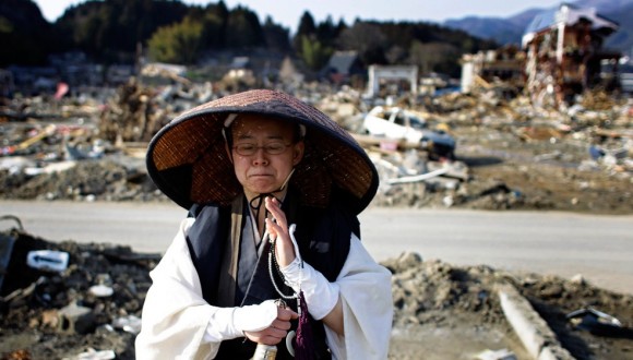 Un monje budista reza frente a un área devastada por el terremoto y el tsunami en Rikuzentakata, en la prefectura de Iwate. Foto: AP